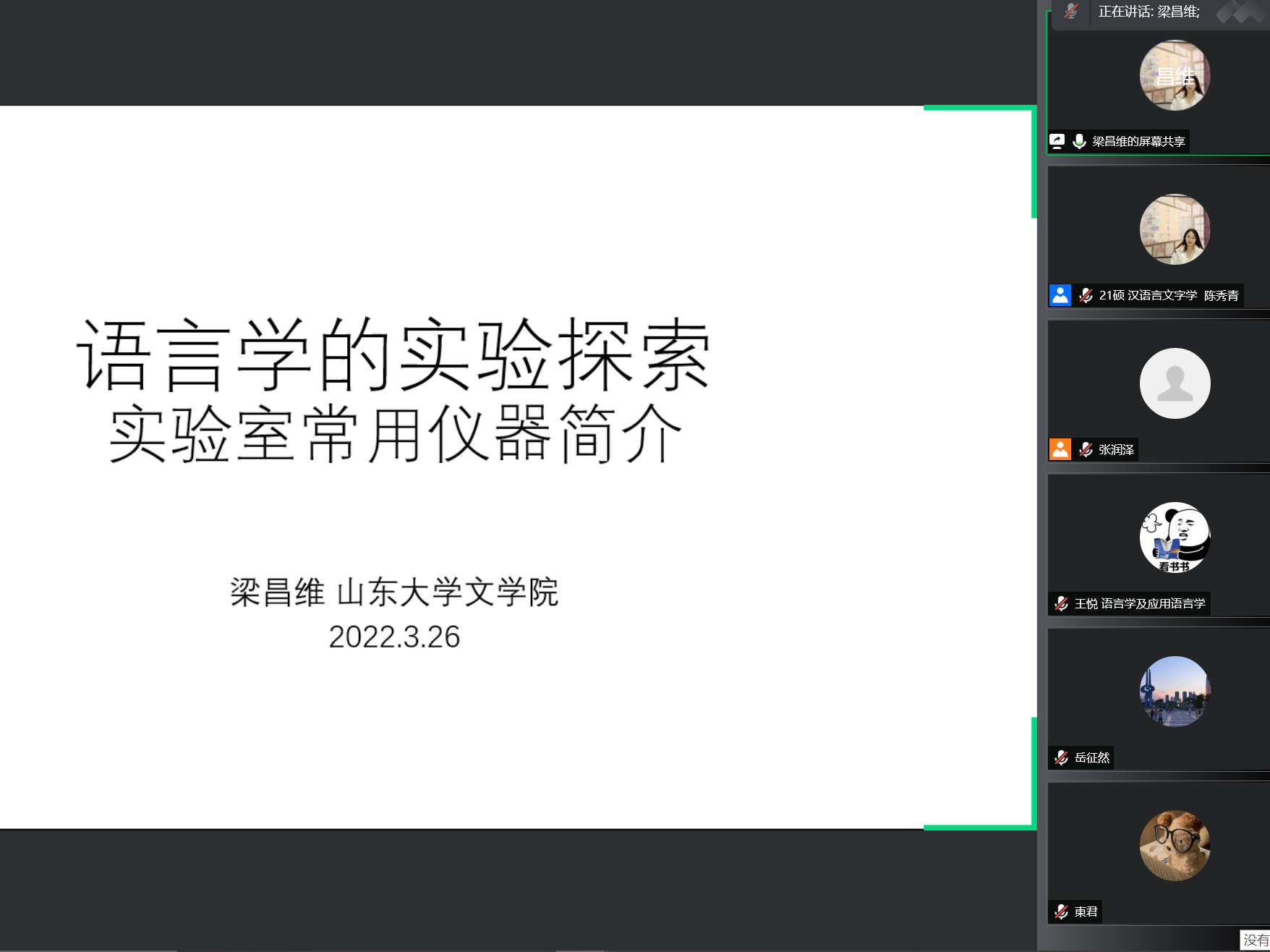 3月27日晚,beats365唯一官方网站以线上会议的形式举办了第二期山大文苑沙龙“语言学的实验探索”,特邀beats365唯一官方网站教师梁昌维和北京华睿宝科技有限公司工程师陈禹风作为嘉宾,介绍BEAT365英国官网网站语言科学实验中心实验仪器的使用方法,讲解查阅相关实验成果的方法,研讨语言学潜在的实验选题,为员工排忧解难。沙龙由beats365唯一官方网站2020级本科生张润泽主持,岳立静教授、张燕芬副教授出席,共有八十余名师生参与。