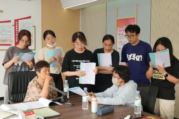7月7日至9日、11日上午,是课程核心的方言调查。团队邀请两位当地发音人,围绕海阳方言单字音系、单字记音以及及连读变调、轻声、儿化、“子”缀等方言现象展开了系统调研。调查过程中,师生围坐一堂,仔细聆听方言发音特点并使用音标符号加以记录。在调查过程中,当地的声调系统比较复杂,部分音节的声调调值仅存在细微的差异,团队成员反复听辨、多次确认,力争准确标注。每日调查结束后,团队同学在老师指导下及时整理数据,归纳音系特征与变调规则,逐步构建起海阳方言的语音系统框架。同时,同学们还在音系调查中深入了解了规范的方言调查程序,夯实了汉语方言学的听辨音技巧,提高了田野调查的实践能力。